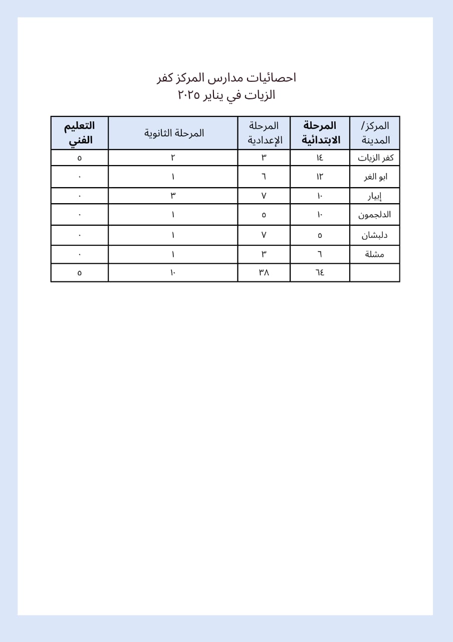 تعكس هذه الإحصائيات لشهر يناير 2025 التوزيع الحالي للمدارس في مختلف المراحل التعليمية بمركز كفر الزيات. وتظهر تبايناً واضحاً بين المدن في حجم الإقبال على كل مرحلة، مع ملاحظة الغياب شبه الكامل للتعليم الفني باستثناء مدينة كفر الزيات إن فهم هذه التوزيعات يمثل خطوة هامة نحو تطوير استراتيجيات تعليمية مستهدفة تلبي احتياجات كل منطقة وتسعى لتعزيز جميع أنواع التعليم بشكل متوازن التعليم الثانوي والفني متمركز في المدينة أكثر من القرى”.